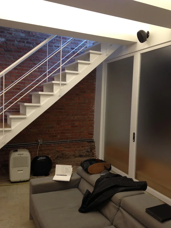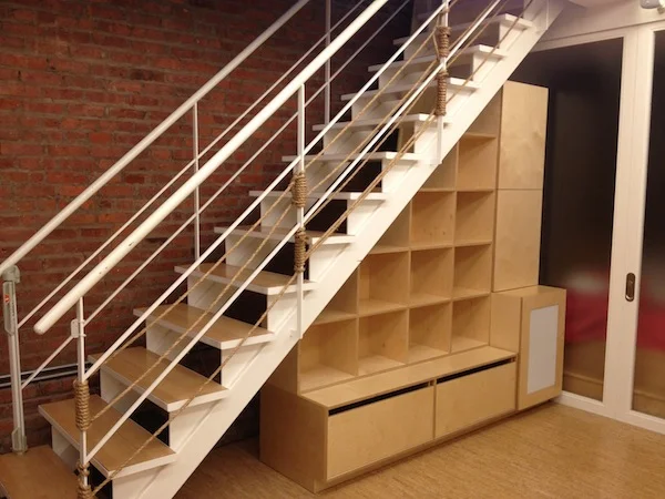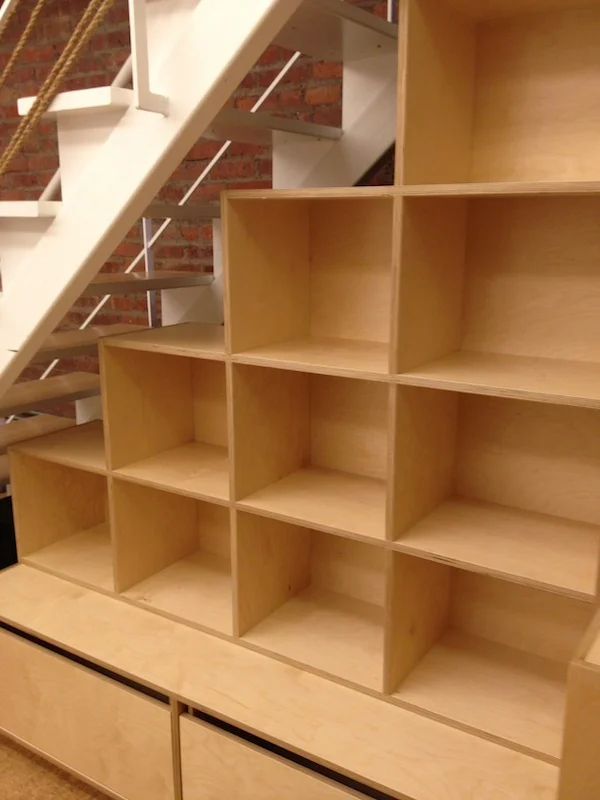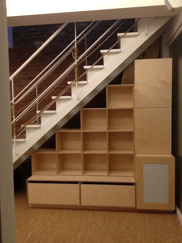 The space beneath this staircase was an underutilized and oddly-shaped area that required a highly customized solution. I designed and built a cabinet equipped with loads of shelving space, both open and enclosed, as well as deep drawers.